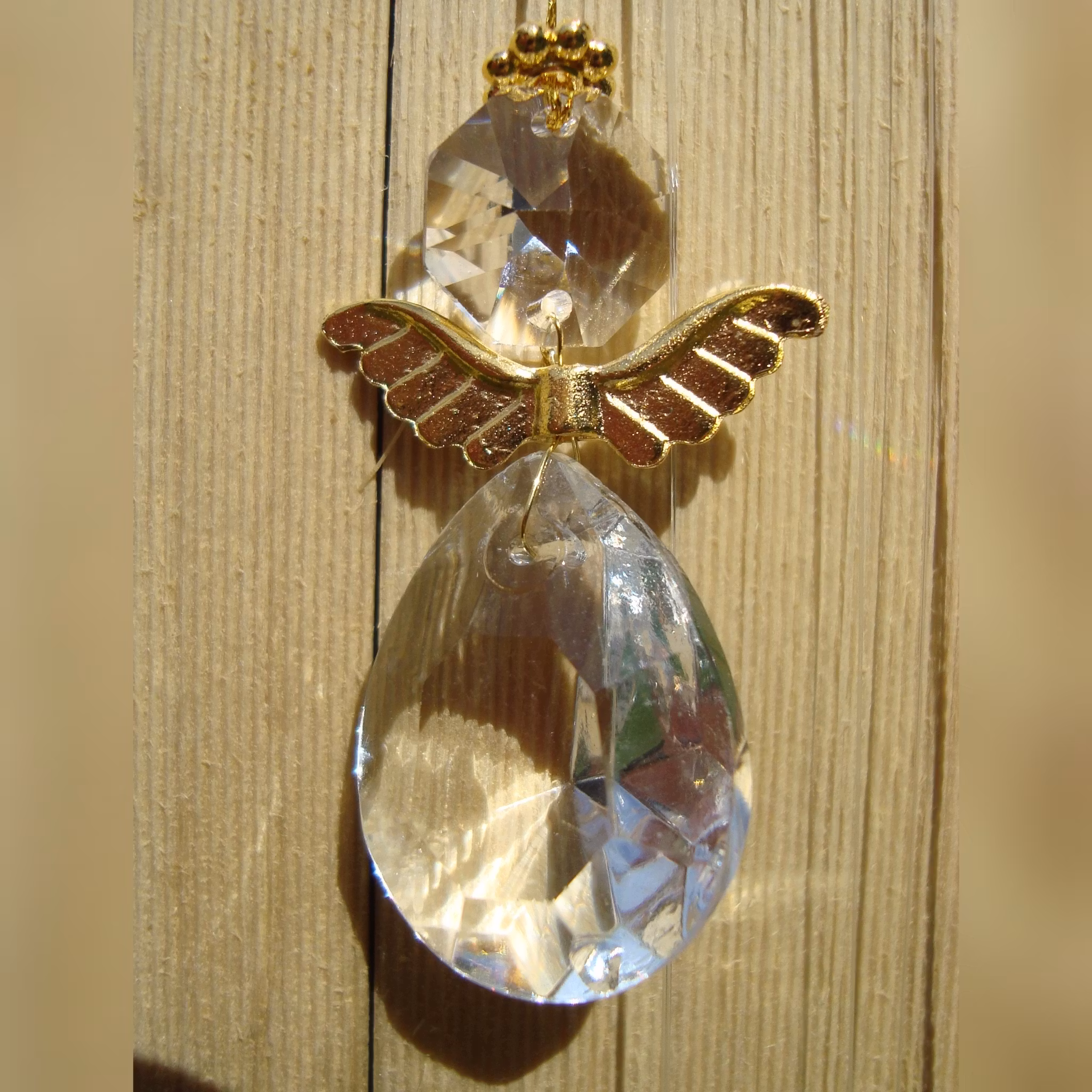 … är en liten ängel skapad av en mindre, vackert oliksidigt slipad droppformad prisma från en gammal fönsterlampa.