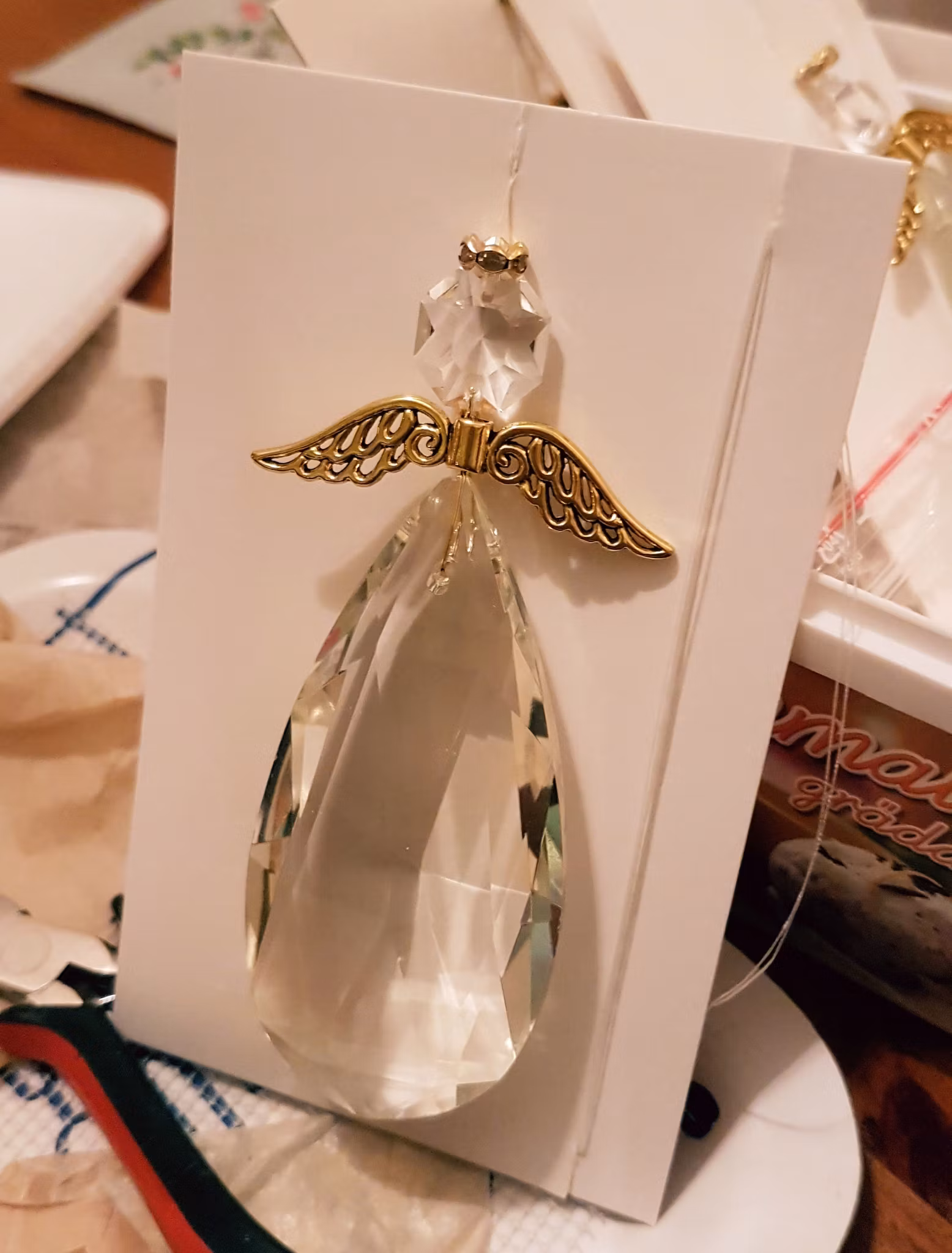 Med ett huvud i finaste kristall och en strassgloria på det, blir den en riktigt fin skyddsängel!