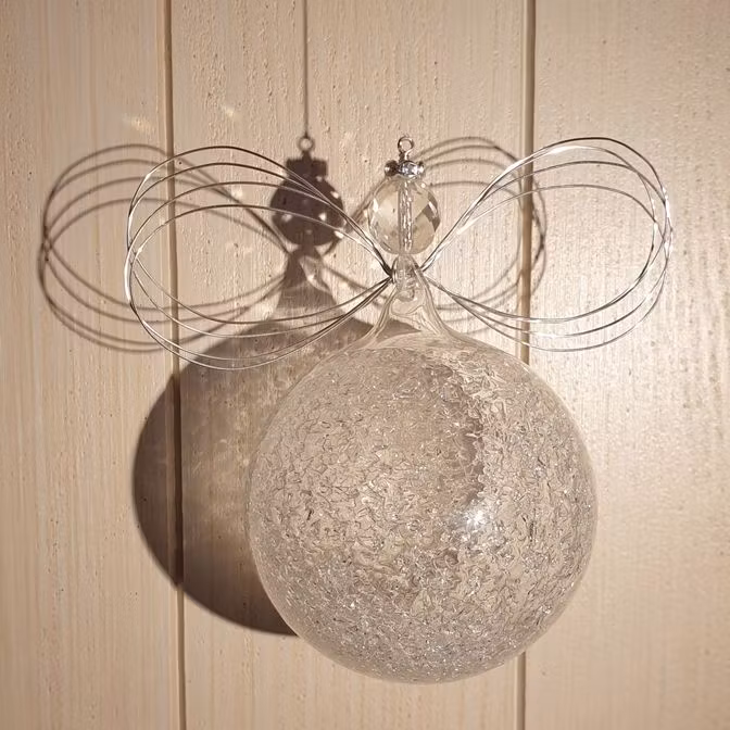 Spännande ofärgad Kul-ängel med vackert mönster som påminner om snö eller frost. Facetterad pärla till huvud och vingar och gloria i silverfärg.