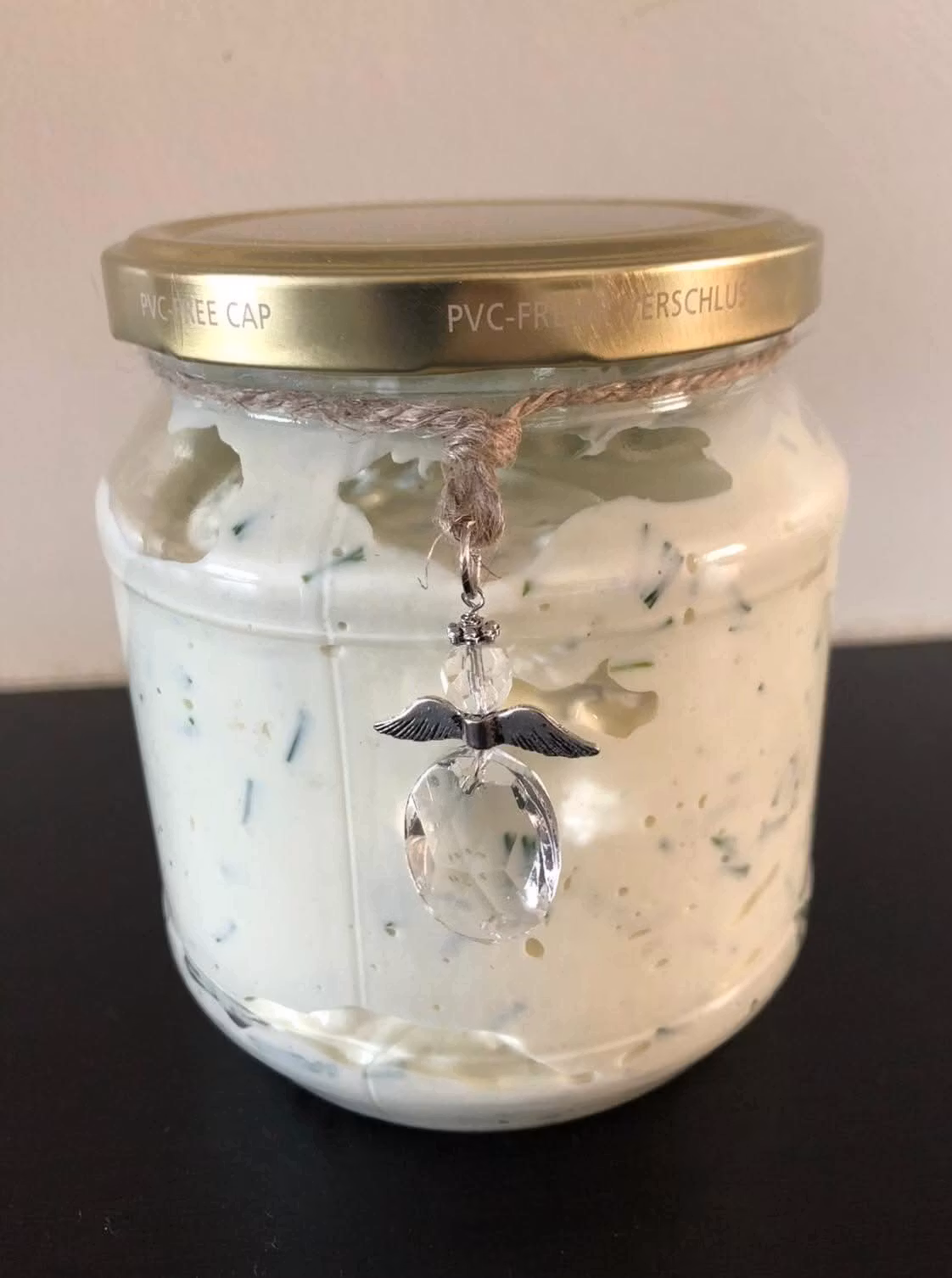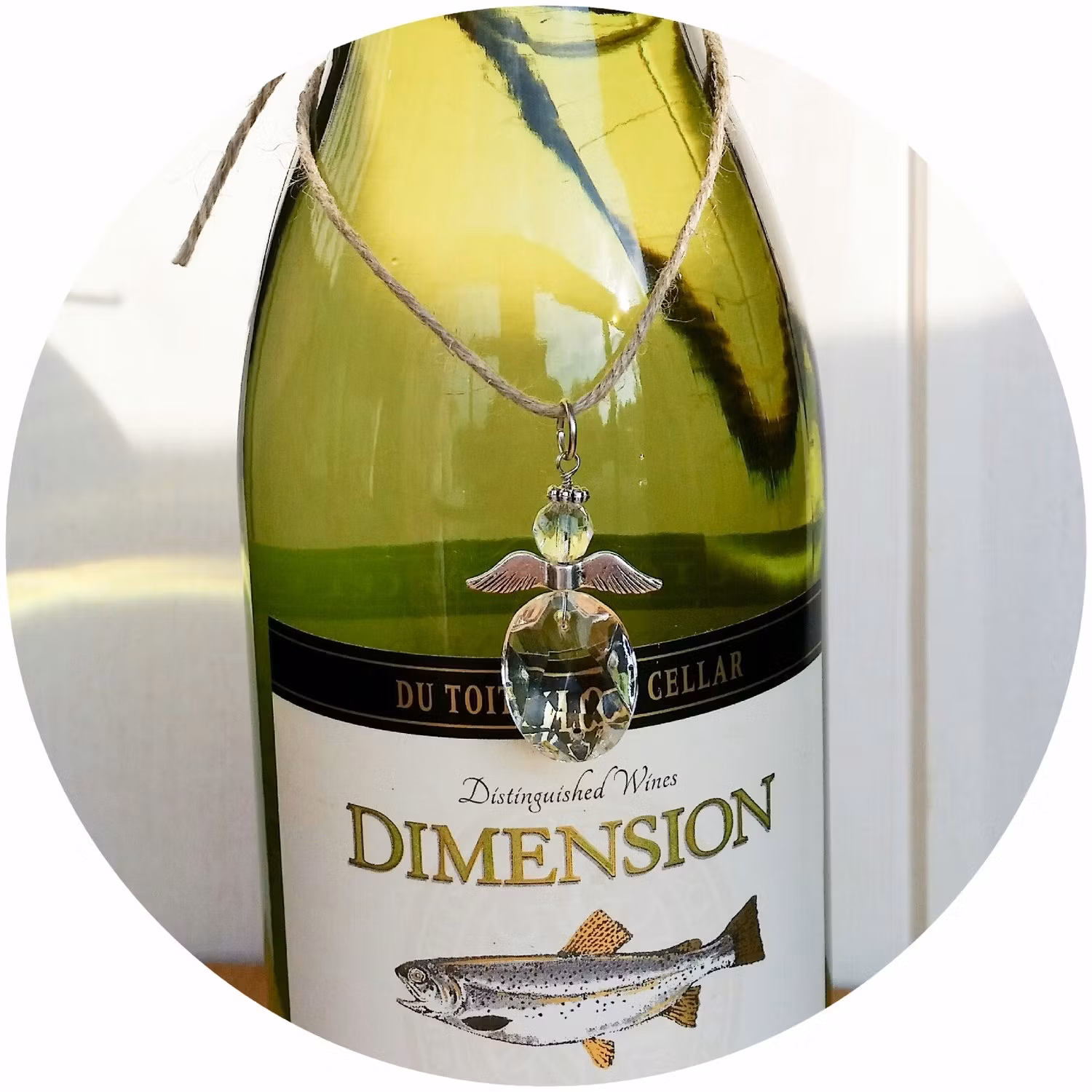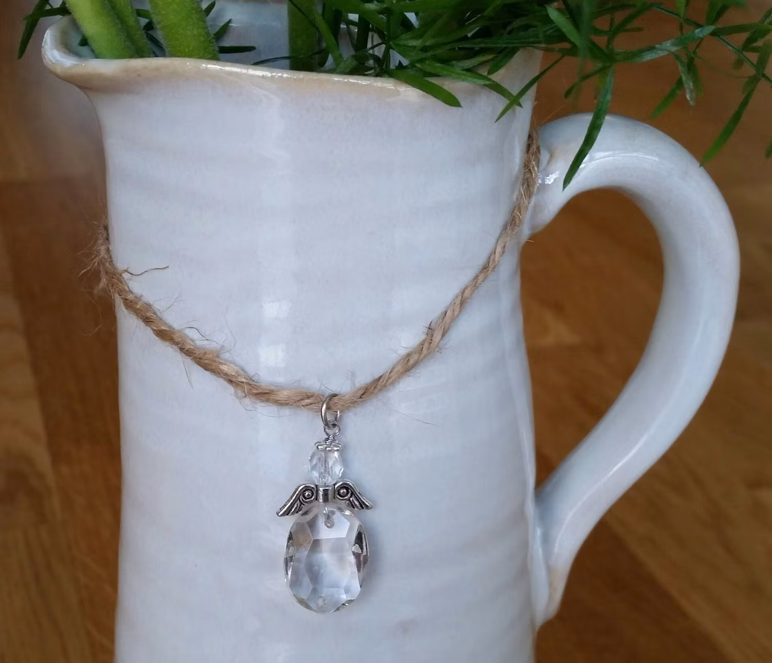Ängeln på snöret passar lika bra runt en vas som runt en vinflaska, eller varför inte som personlig utsmyckning av ett inslaget paket.
