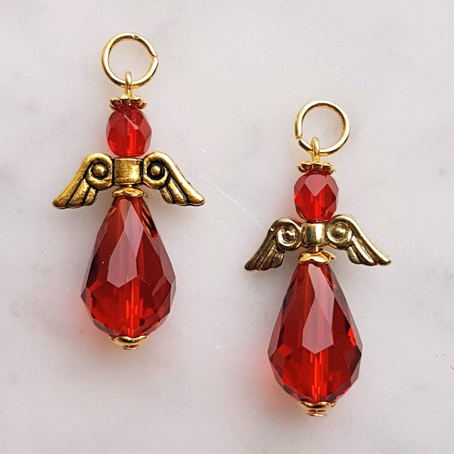 En vackert röd jul-ängel med droppformad kjol, skapad av härligt julröda kristallpärlor och vinge och gloria i guldfärg.