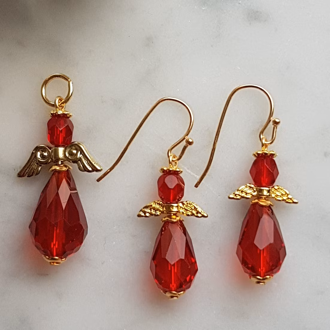 Söta små örhängesänglar som passar till julens alla fester.Skapade av droppformade röda kristallpärlor och vinge och gloria i ljus guldfärg.
