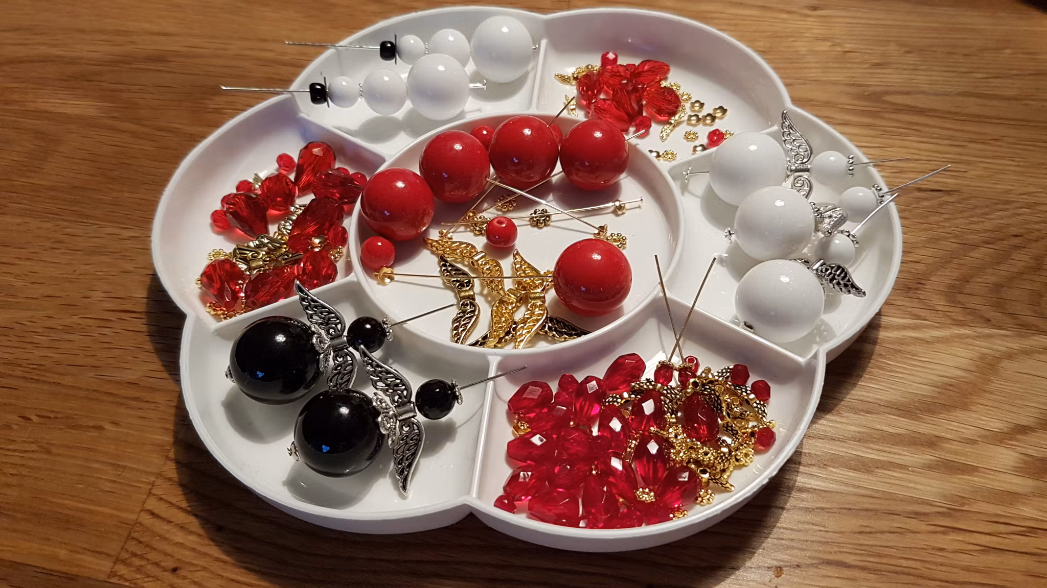 Skapade av droppformade röda kristallpärlor och vinge och gloria i antik guldfärg.