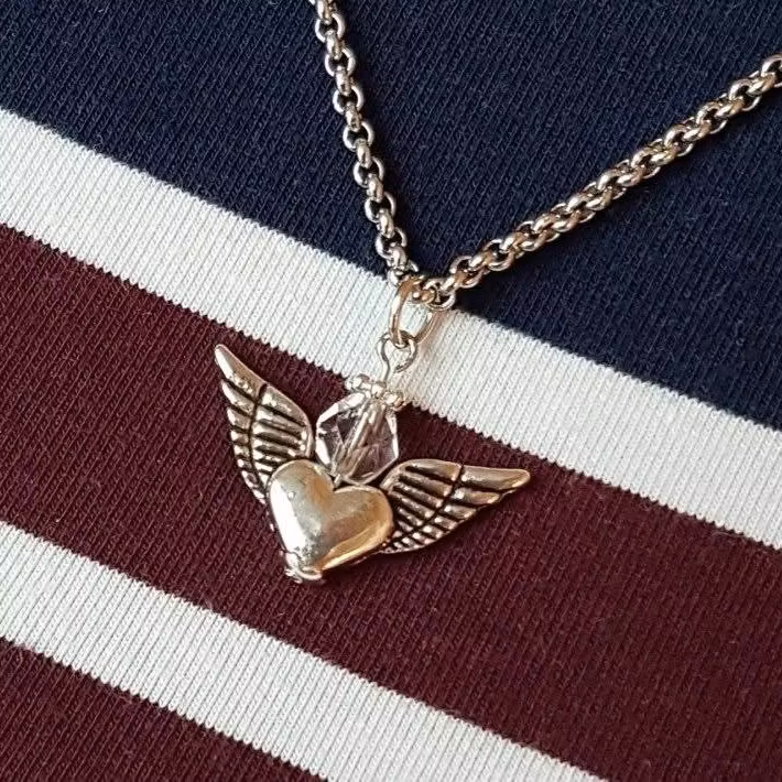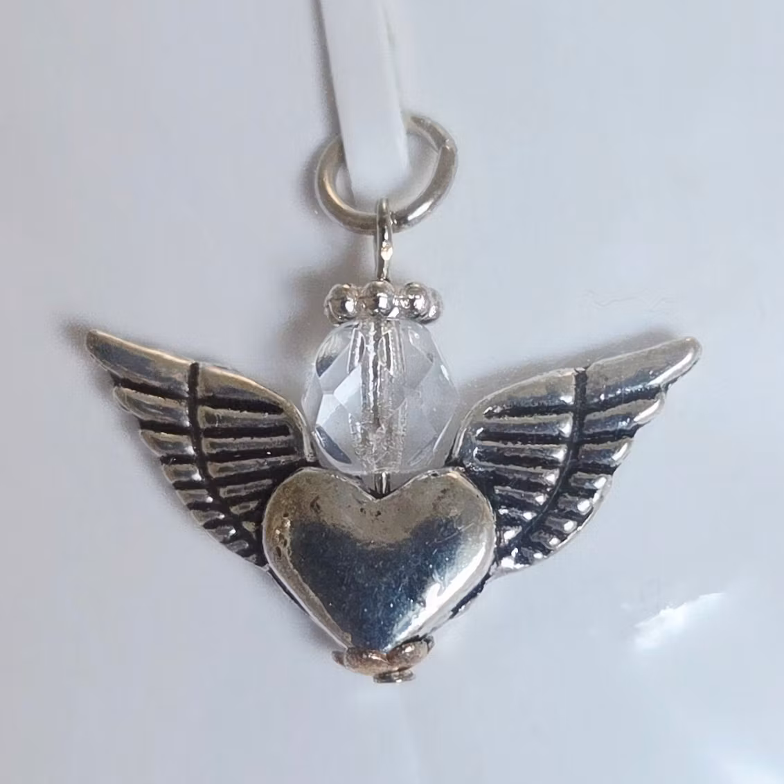 En annorlunda liten ängel med en antikt silverfärgad vinge med ett hjärta i mitten och en kristallpärla som huvud.