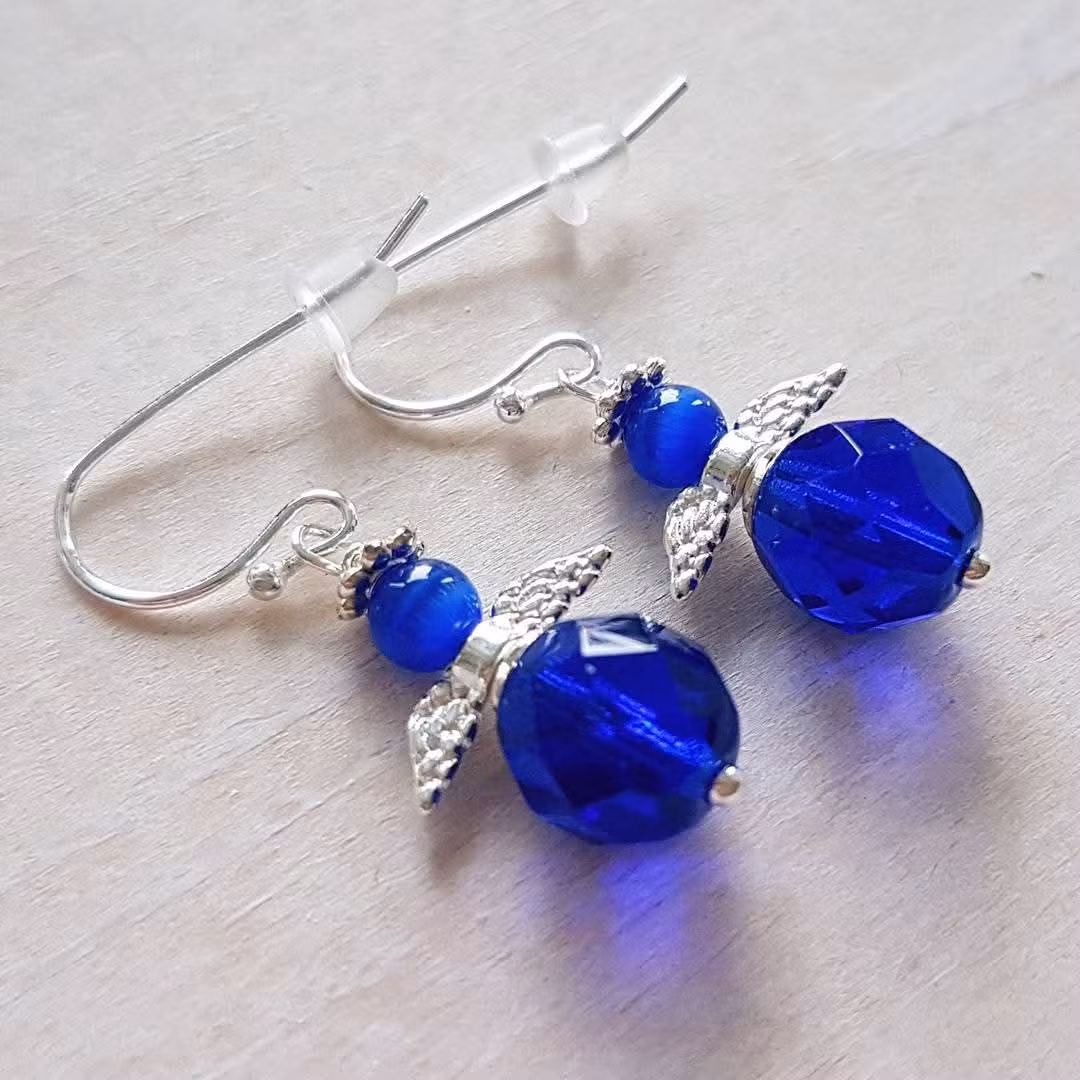 Två små djupt blå änglar i ett vackert örhängespar.Vinge, gloria och krokar i ljus silver- eller guldfärg.