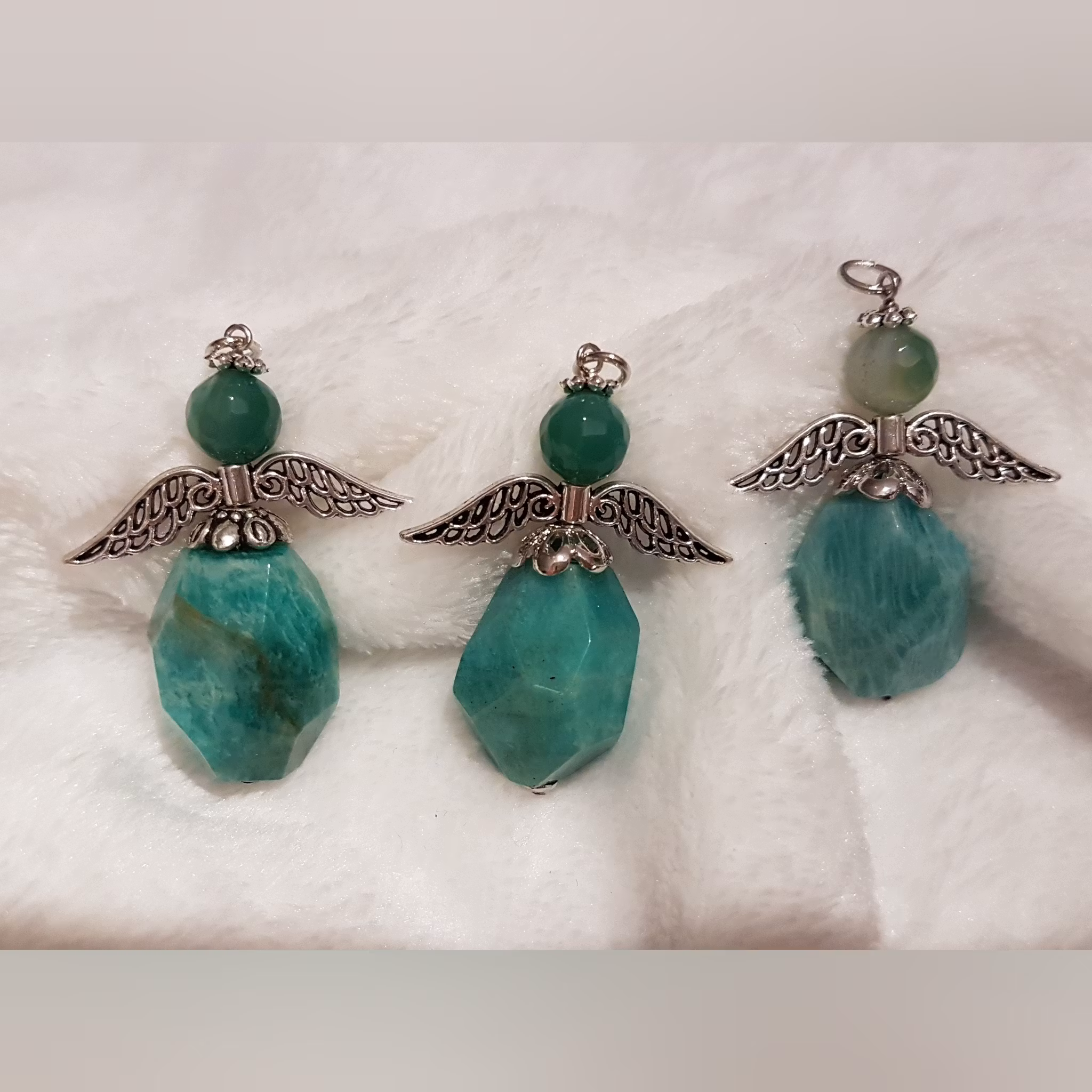 Nyckelord: amazonit, grön aventurin, turkos, skyddsängel, hänge, kristallhänge, halvädelsten, balans, lugn, tur, energi, änglasmycke