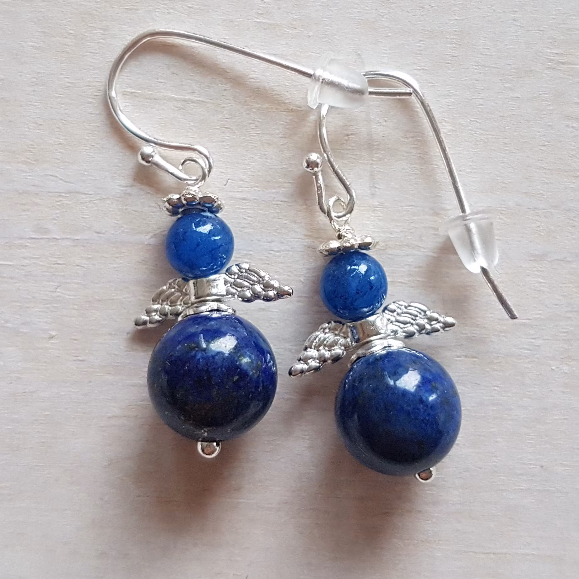 Elegant liten smyckesängel som örhängen, skapad i blå apatit, en sten som skimrar i havets nyanser.