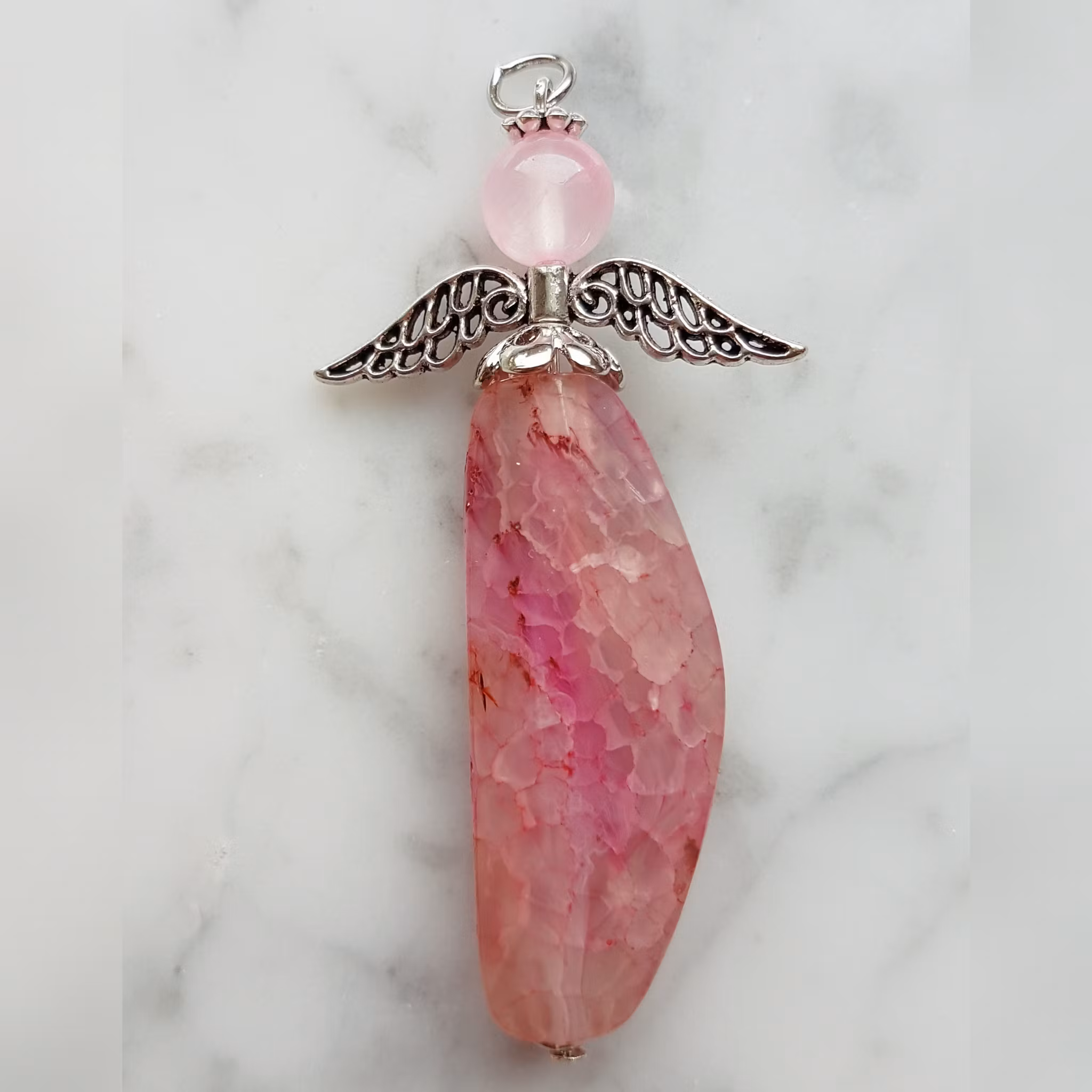 Detta imponerande änglahänge kombinerar en kropp i färgad rosa crackle-agat med ett huvud i rosenkvarts.
