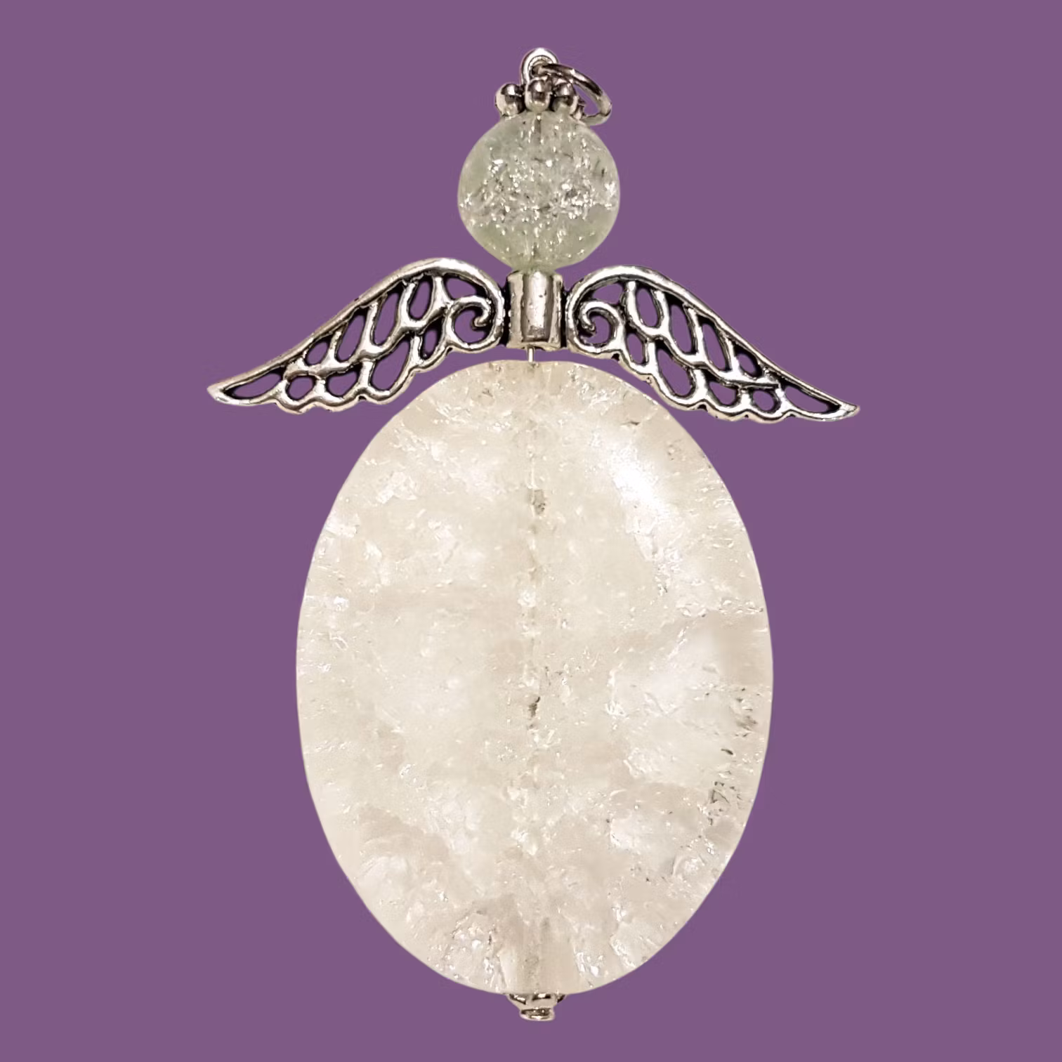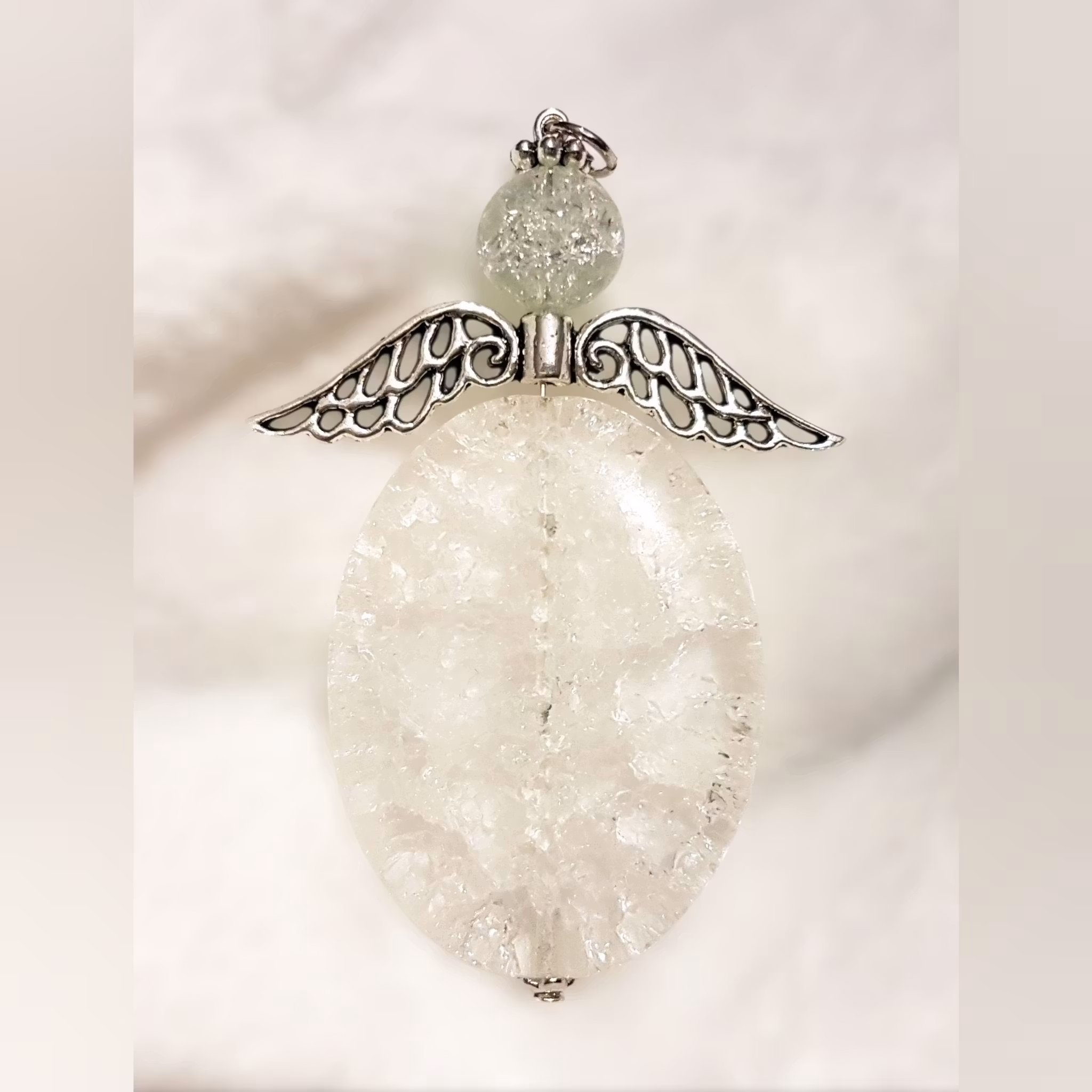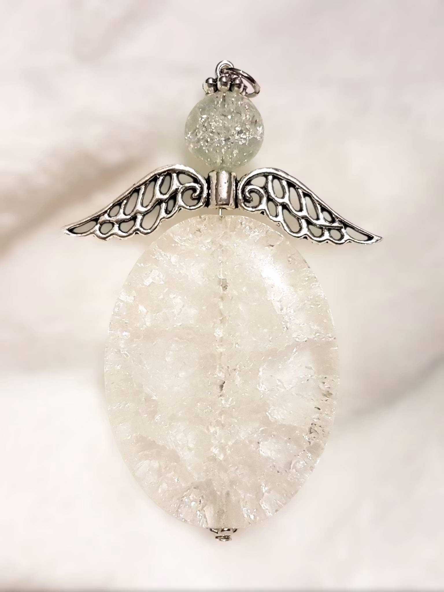 ... är en vacker ängel med en oval mage i en lite plattare pärla av crackle bergkristall. Den spruckna effekten i stenen gör att ljuset reflekteras i vackra mönster.