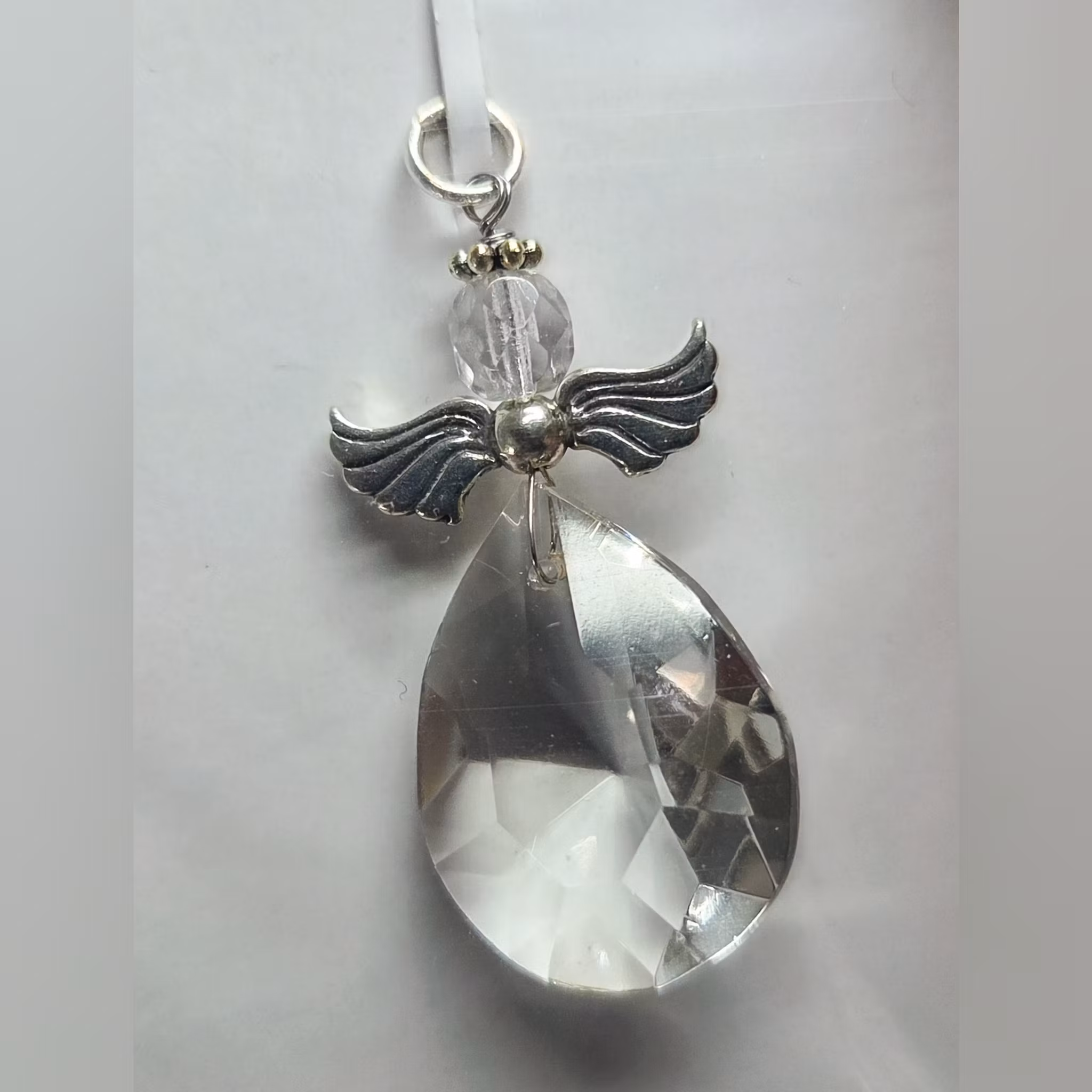 Ängeln är skapad av en liten, handslipad droppformad prisma som jag inte hittar så ofta. Därav har den fått sin särskilda silvervinge och finns i ett mindre antal.