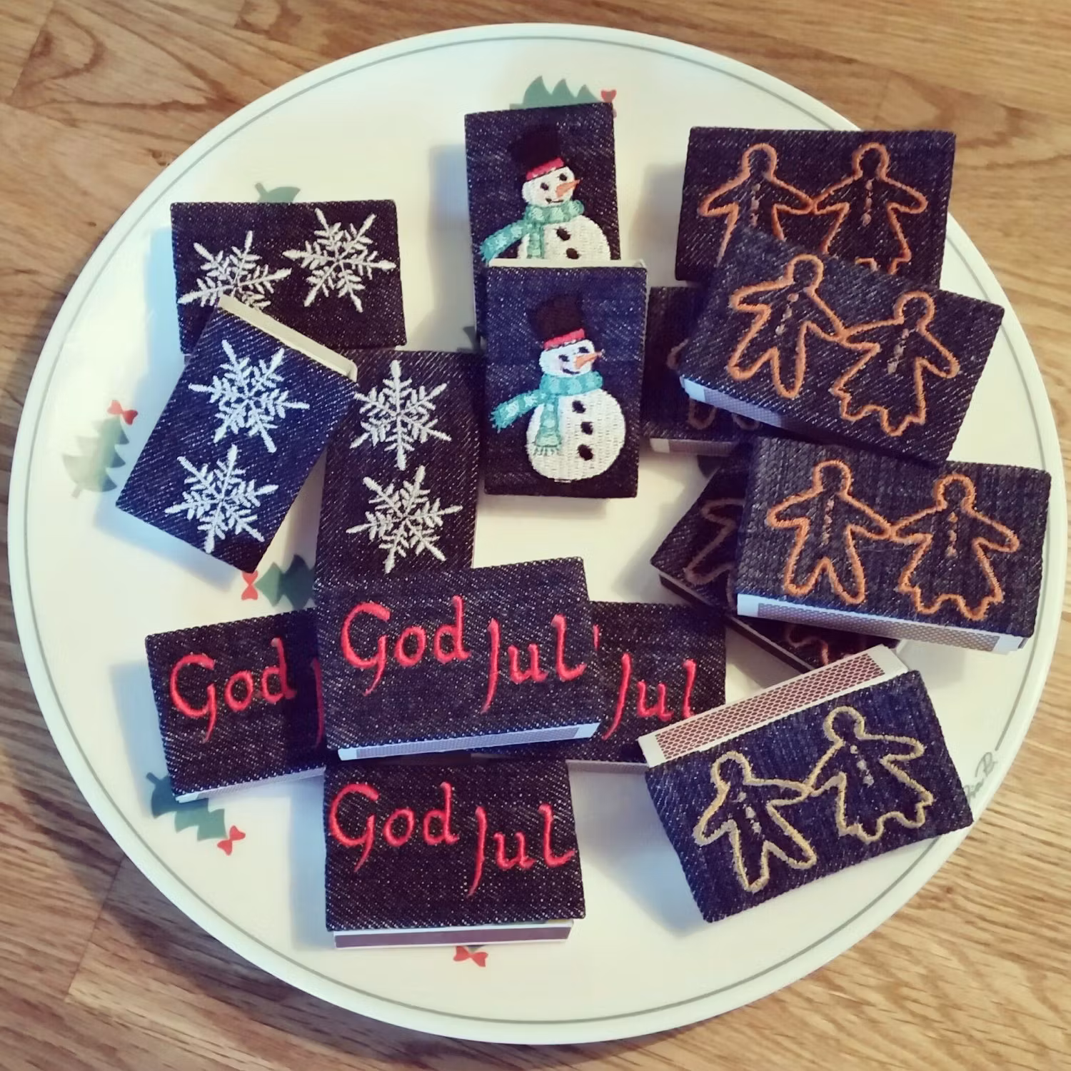 ... på Angels and Stuff's vis. En tändsticksask som pryder sin plats med ett litet julmotiv broderat på ovansidan. Motivet är broderat på återbrukade jeans,
