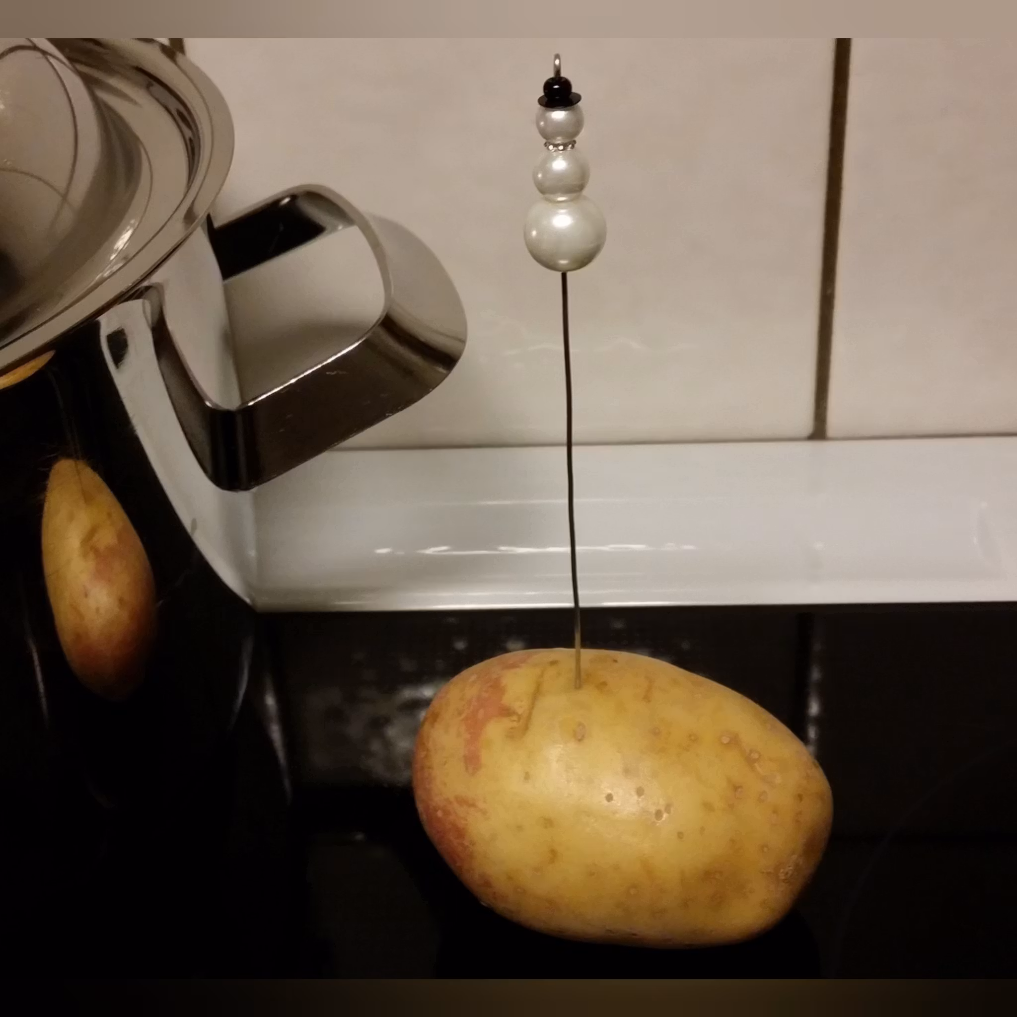 ... är tillverkad av rostfri tråd och vaxade glaspärlor och hjälper dig att koka julpotatisen till perfektion.En rolig gåva till värdinnan.
