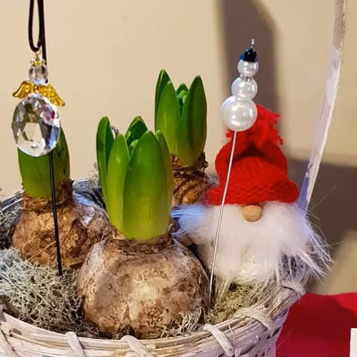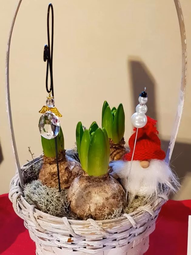 ... är tillverkad av rostfri tråd och vaxade glaspärlor.En trevlig värdinnegåva nedstucken i en fin julblomma.