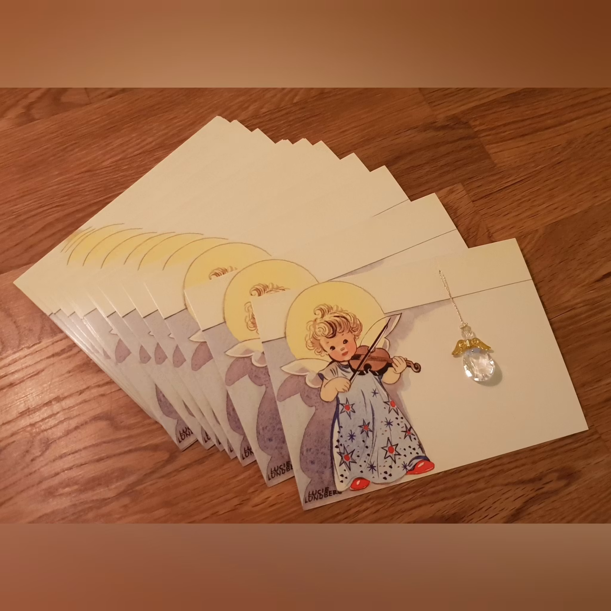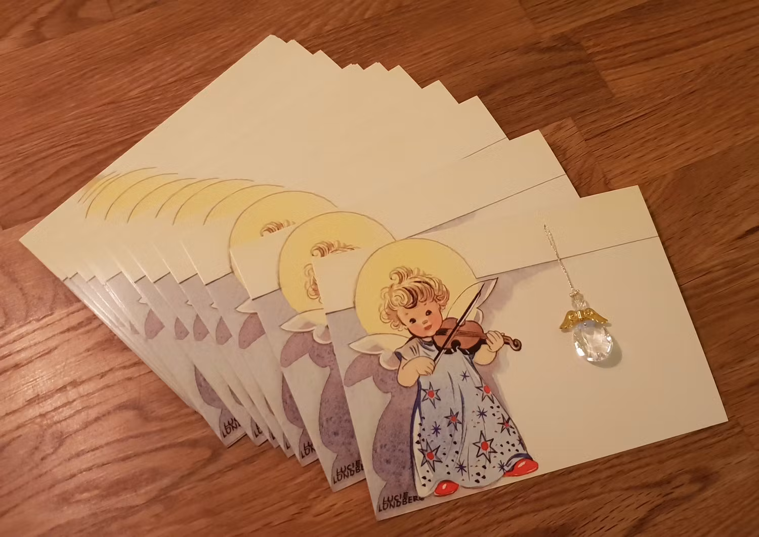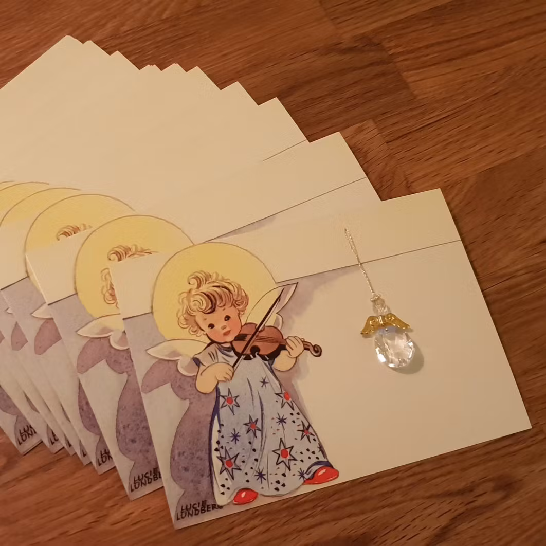 Ett vackert julkort med den lilla julängeln No1 hängandes färdig för att flytta över till julgranen med en personlig hälsning från Dig.