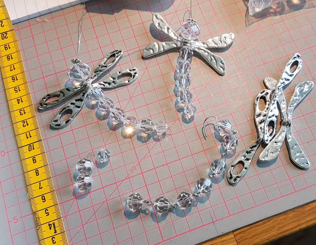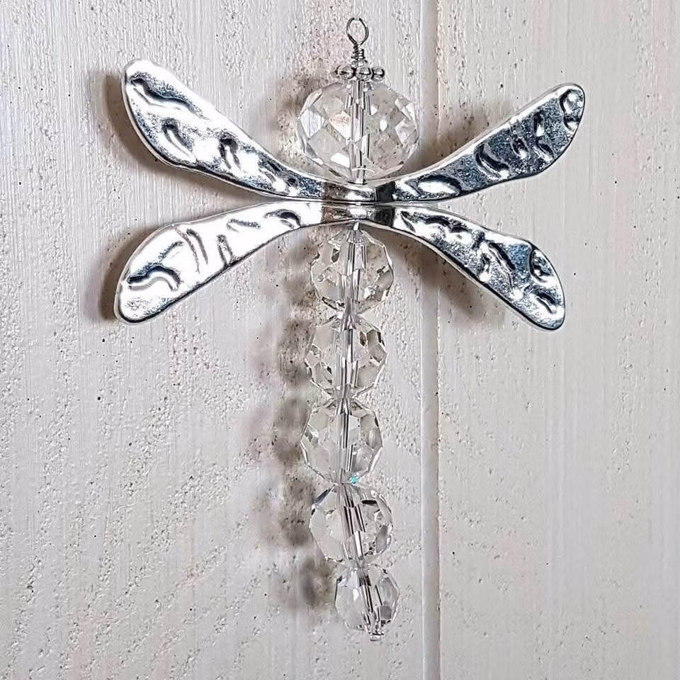 … är skapad av sex vackra kristallpärlor från en gammal kristallkrona. Huvudet är en lite bredare pärla och de dubbla, hamrade vingarna är i antik silverfärg. När denna slända får hänga fritt och snurra i ett soligt fönster, skapas ett fantastiskt färgspel på väggar, tak och golv i rummet!