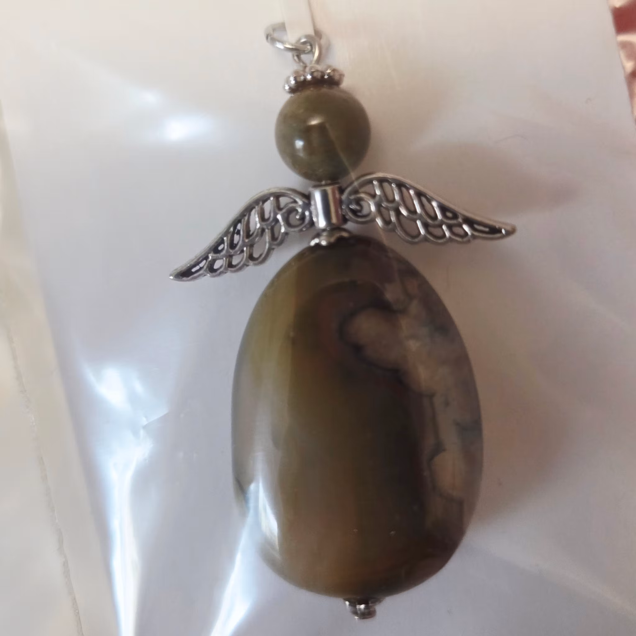 En speciell och vacker smyckesängel tillverkad av mossagat i olika naturliga bruna toner och mönster.