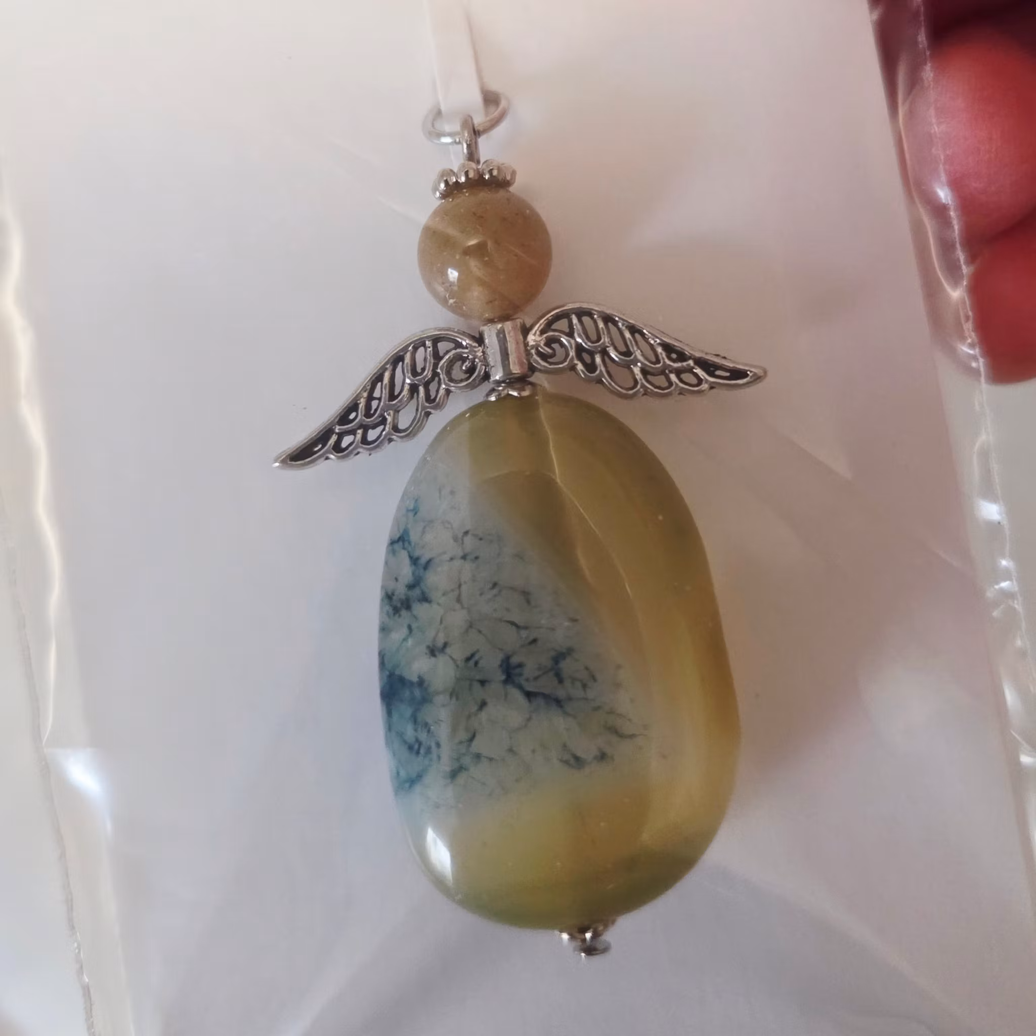 En speciell och vacker smyckesängel tillverkad av mossagat i olika naturliga gula och blå toner och mönster.