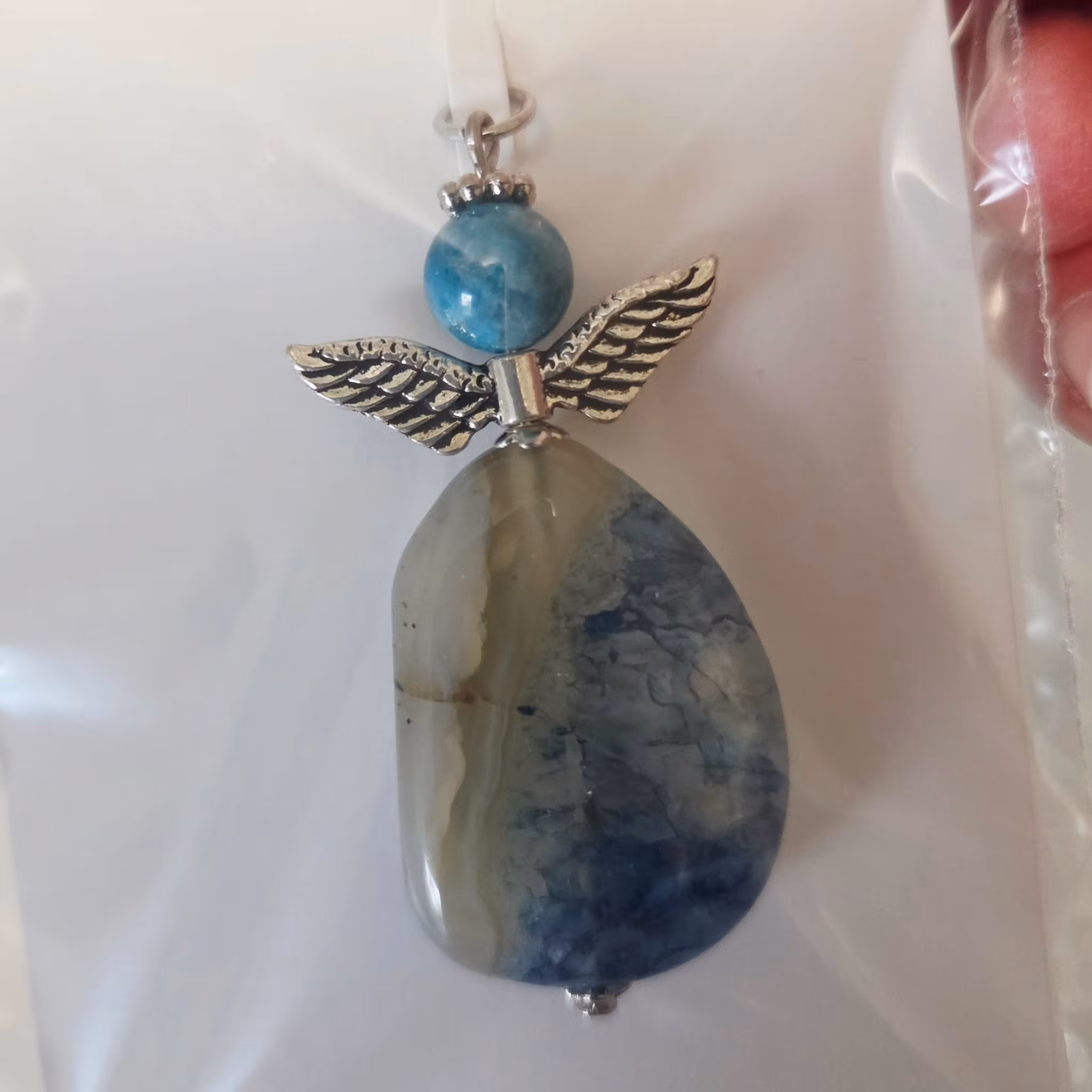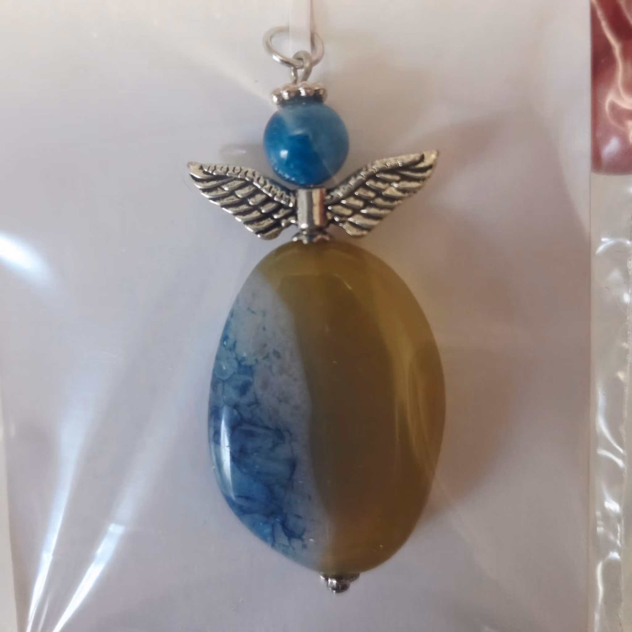 Nyckelord: agat, gul och blå agat, mossagat, halvädelsten, smyckesängel, skyddsängel, kristallängel, healingsten, jordning, balans, trygghet, styrka, unika mönster, handgjord ängel, gåva