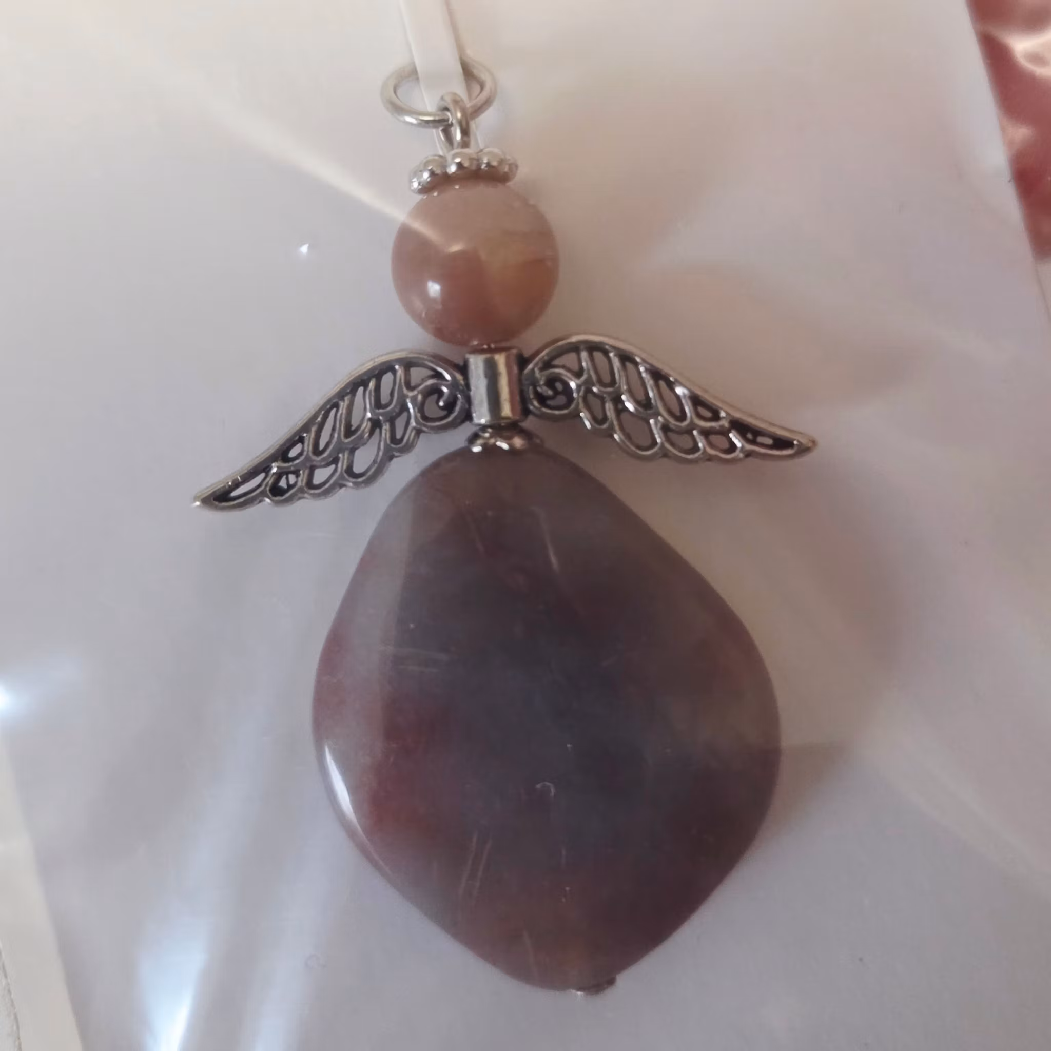 En speciell och vacker smyckesängel tillverkad av mossagat i olika naturliga rosaröda toner och mönster.