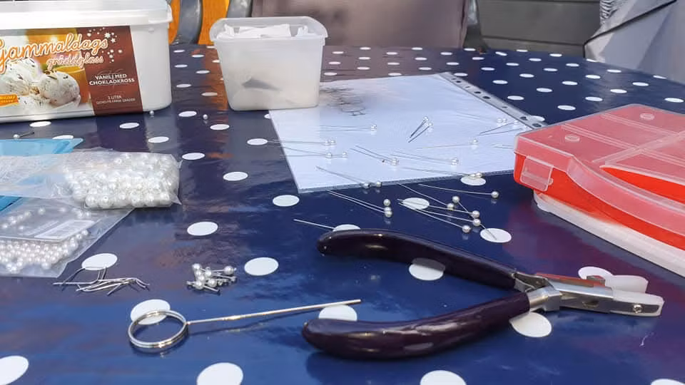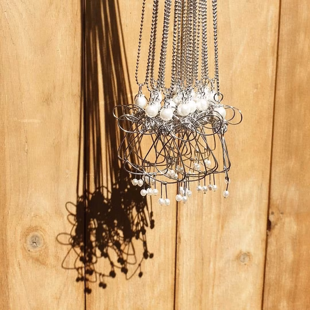 … är skapad för hand i rostfri tråd med vaxade glaspärlor som huvud och roligt dinglande fötter.