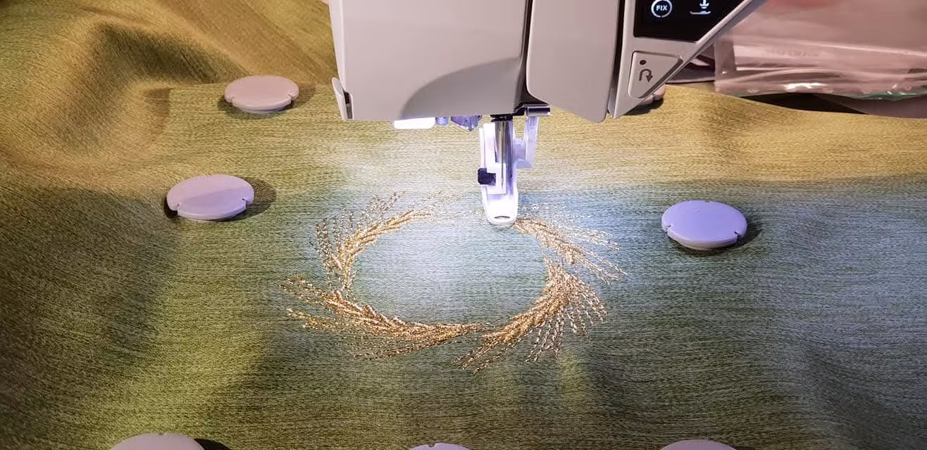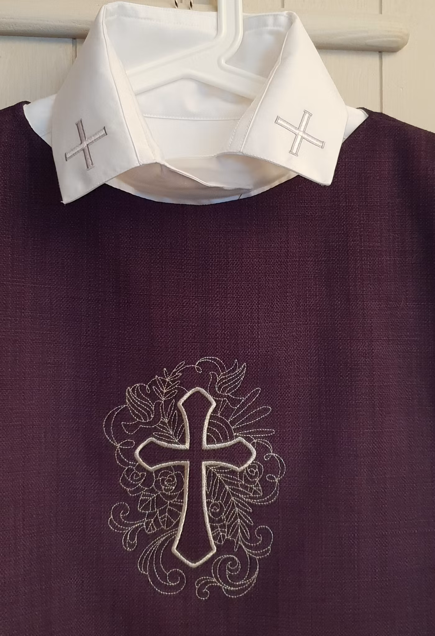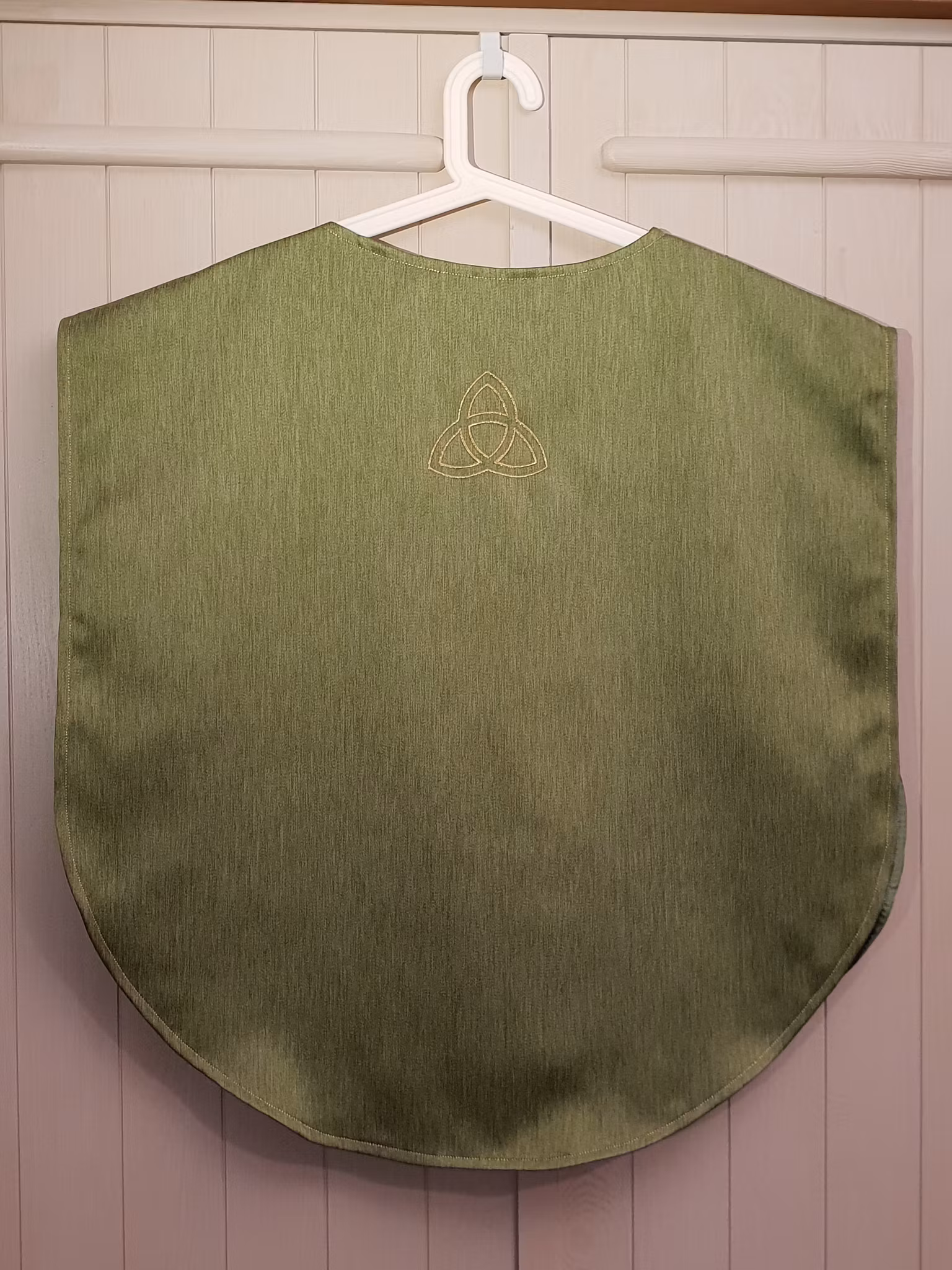 Grön mässhake i barnstorlek för lekkyrkan och barnens egen katedral. Brodyr enligt bild i guldfärgad metallictråd.