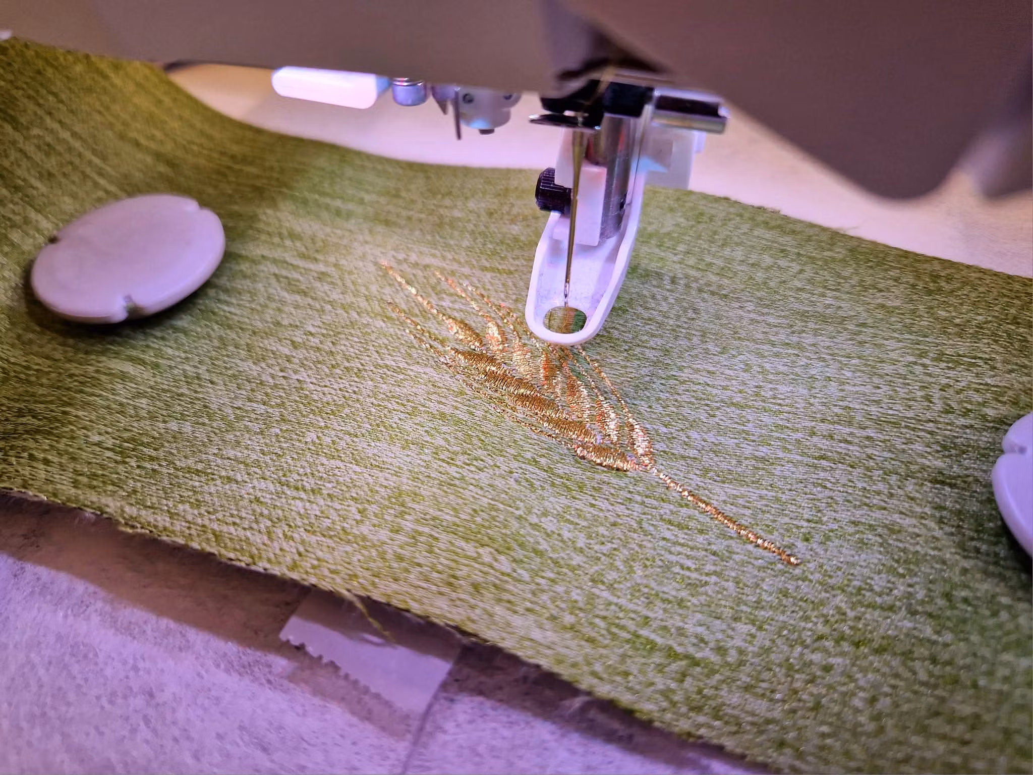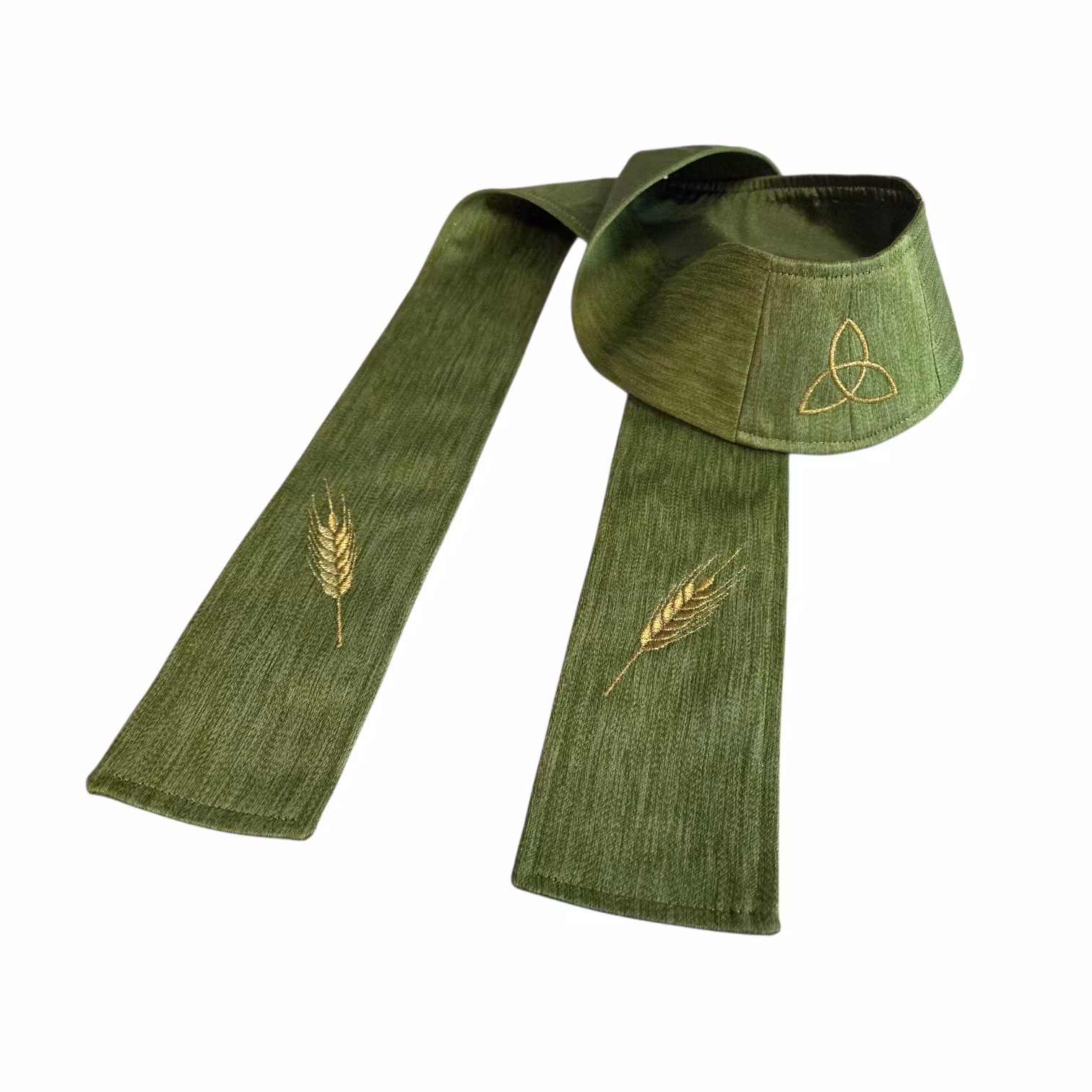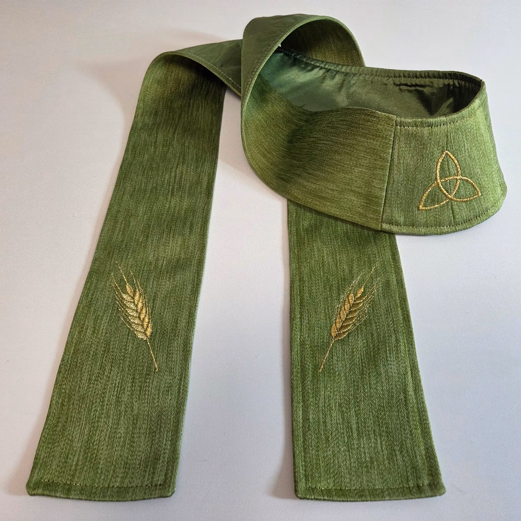 Grön präststola till lekkyrkan med broderade veteax samt treenighetens symbol broderad i guldfärgad tråd.