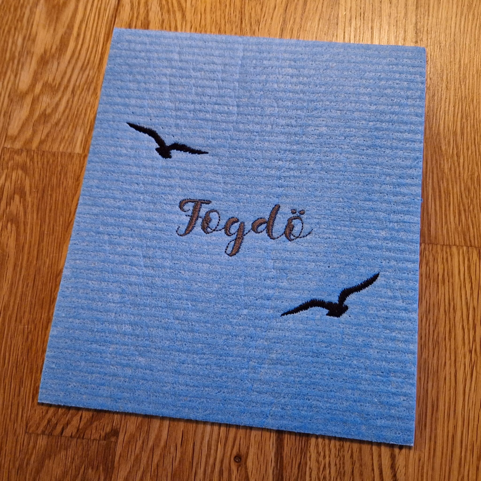 Disktrasa med text och motiv enligt bild.Trasan kan fås i valfri färg - meddelas i kassan eller via kontaktformuläret. Detsamma gäller vid önskemål om annan text ihop med fiskmåsarna.