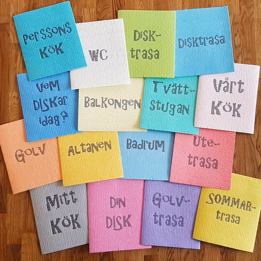 Önskad färg på respektive trasa och/eller önskemål om egen text meddelas i kassan eller genom kontaktformuläret.