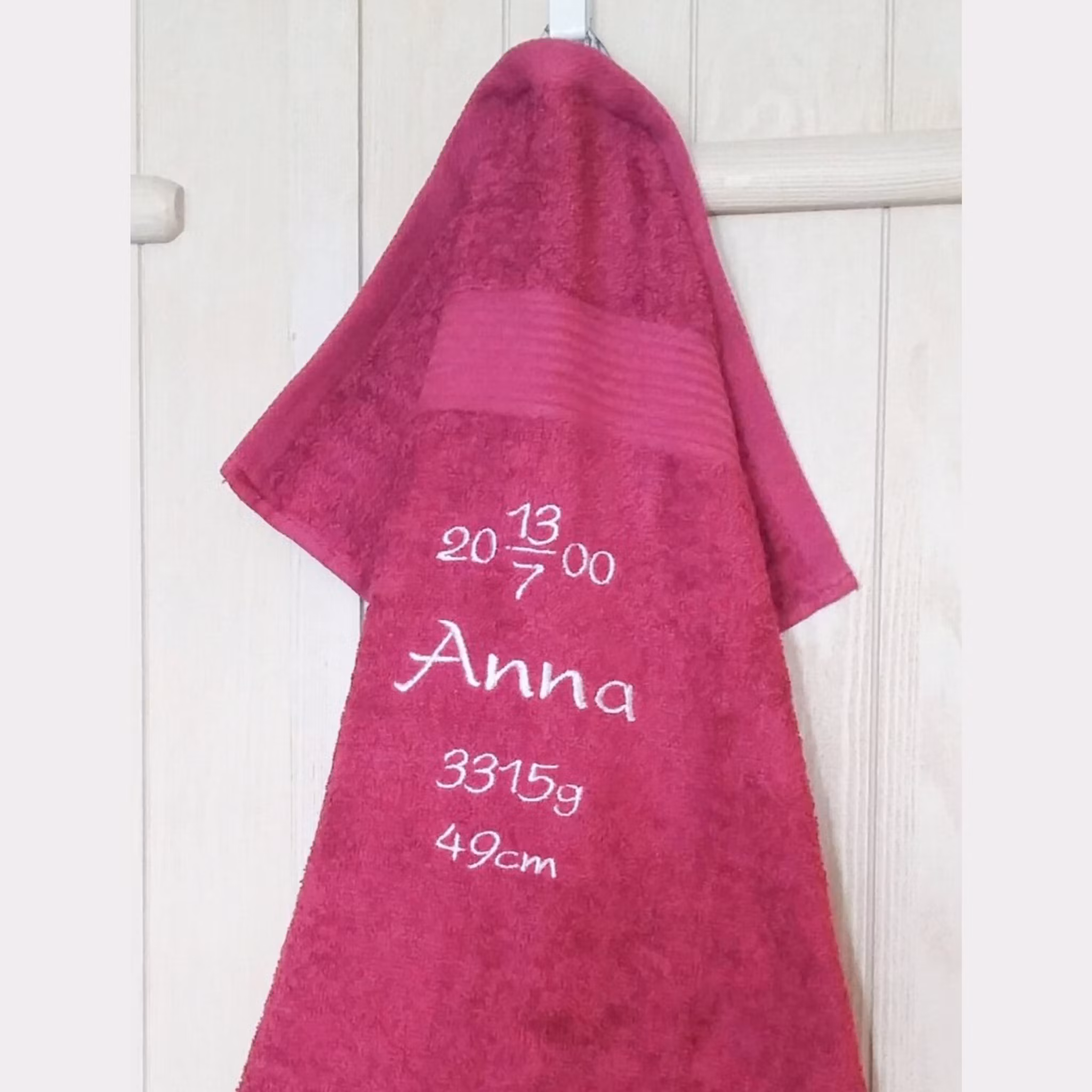 En personlig handduk i valfri storlek (se alternativ) med födelseuppgifter enligt bild.