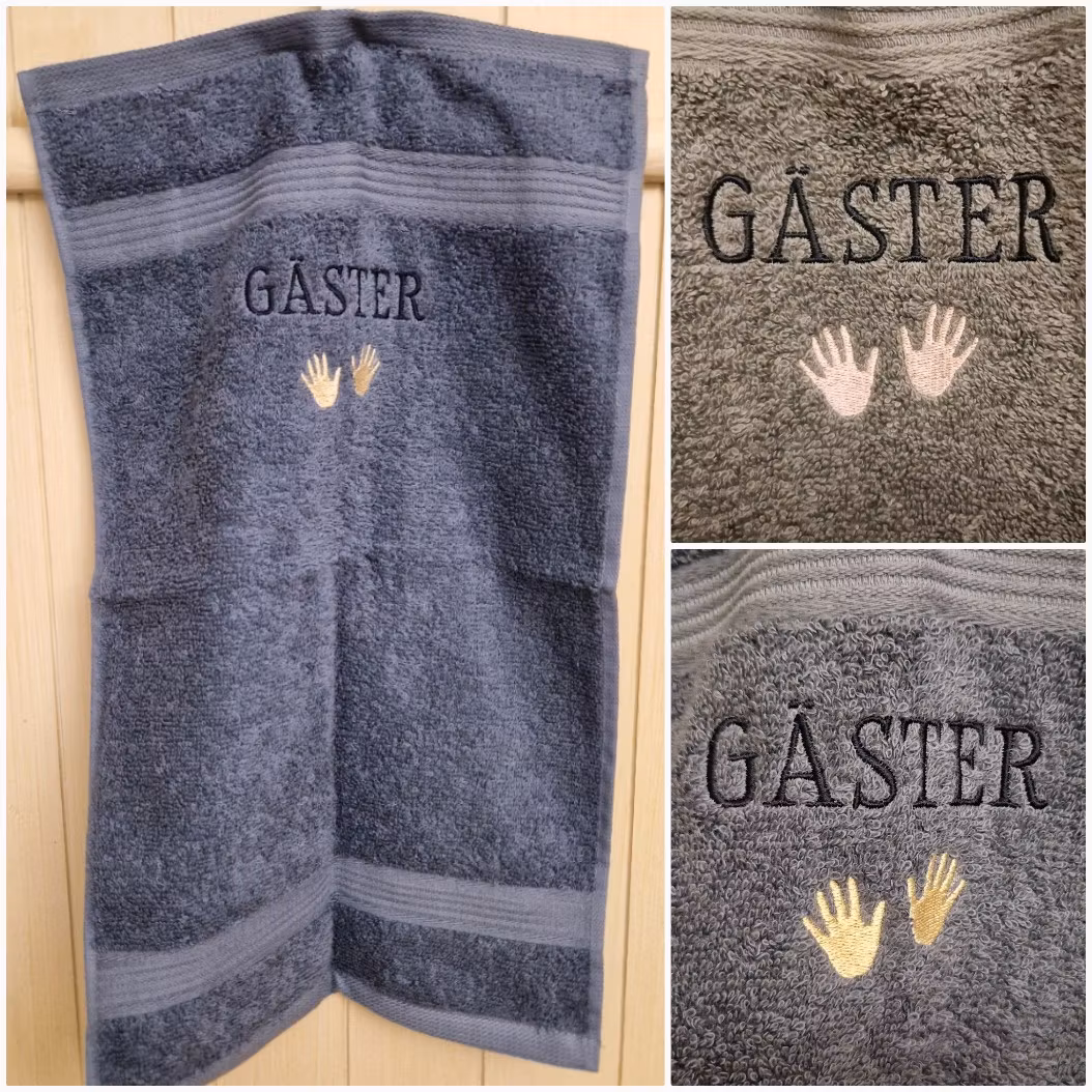 En kul gästhandduk med broderade händer på.Storlek 30x50 cm.Du kan beställa/köpa din gästhandduk här och sen skriver du i kontaktformuläret viken färg du önskar på handduk och brodyr.