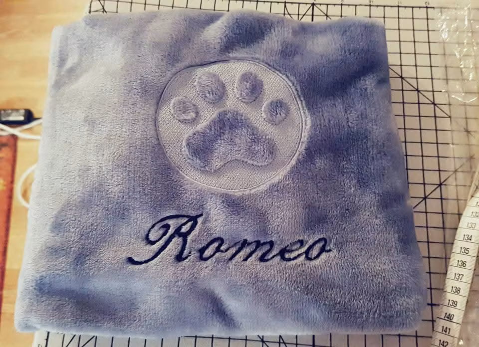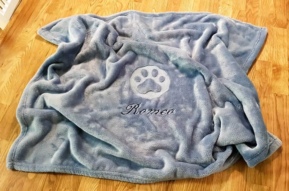 En härligt mjuk filt med din pälsklings namn och tassar broderade på.